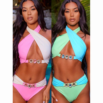 Traje de baño de diamantes de imitación a juego de colores Nueva llegada Halter Sexy Traje de baño Retro Diamond 2 piezas Bikini Set